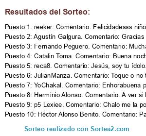 - Ganador 5: reca8. Comentario: Jesús, soy tu ídolo. Encantado de conocerme. Suerte a todos!