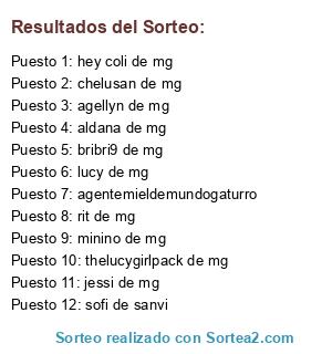 Lista de participantes: rit de mg, lucy de mg, jessi de mg, chelusan de mg, thelucygirlpack de mg, minino de mg, bribri9 de mg, hey coli de mg, agellyn de mg, aldana de mg, agentemieldemundogaturro, sofi de sanvi, .