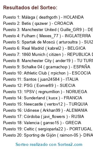 Lista de participantes: Anzhy ( raimon-05 ), River Plate ( ganso15 ), Sunderland ( kuox ), Athletic Club ( rrpichon ), Rubín Kazan ( javi_flowers ), Sao Paulo ( qazwer ), Udinese ( Arkhan99 ), Werder Bremen ( ander19 ), Everton ( Guille_GR9 ), Spartak de Moscú ( arturoultra ), Stoke City ( Citizen93 ), Fulham ( elfus21 ), Psv ( regnumllion ), Getafe ( Eomer89 ), Schalke 04 ( gcamachop ), Newcastle ( vertov12 ), Palermo ( kabrel2 ), Ajax ( deathgoth ), Dinamo de Moscú ( sergioparla22 ), Santos ( juan24584 ).