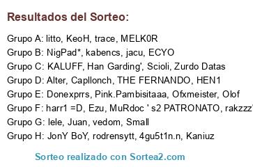 Lista de participantes: Capllonch, Ofxmeister, harr1 =D, MELK0R, MuRdoc ' s2 PATRONATO, Juan, ECYO, KALUFF, kabencs, Small, Han Garding', 4gu5t1n.n, trace, rodrensytt, KeoH, JonY BoY, NigPad*, lele, vedom, Pink.Pambisitaaa, Alter, Kaniuz, THE FERNANDO, jacu, rakzzz', Zurdo Datas, Ezu, HEN1, litto, Scioli, Donexprrs, Olof.