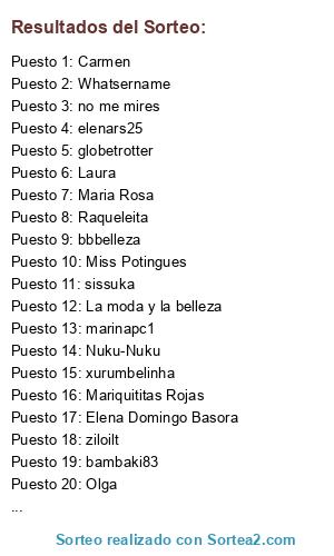 Lista de participantes: Carmen(3 participaciones), besosmulticolor(2 participaciones), zaisei, Miss Potingues(3 participaciones), Laura(4 participaciones), raquel(2 participaciones), Whatsername(3 participaciones), Eleysia, asturianina40, Olga(2 participaciones), Jessi(2 participaciones), Tapeca, Elena Domingo Basora, Isamar, Nuku-Nuku(2 participaciones), no me mires(3 participaciones), Emma J, Raqueleita(2 participaciones), ziloilt(2 participaciones), msevilla, elenars25, PDiana, lola anton, bambaki83, elgjca, Maria Rosa, Mariquititas Rojas(2 participaciones), evacastellon, globetrotter, marinapc1, Marietta, xurumbelinha(2 participaciones), bbbelleza(2 participaciones), NuRya G, La moda y la belleza, sissuka(2 participaciones).