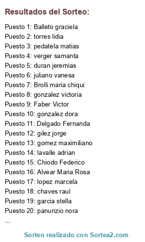 Lista de participantes: Albornoz Cristina (4 participaciones), alvarado rocio (2 participaciones), Alvarado Veronica (5 participaciones), Alvear Maria Rosa (4 participaciones), Antar Verónica (2 participaciones), Badano Mirta (5 participaciones), Balleto graciela (2 participaciones), Barragan Francisco (2 participaciones), Basso Ruben (5 participaciones), Battegazore Gabriela (3 participaciones), Bebilaqua Mabel (3 participaciones), Benitez Rosa (3 participaciones), Brolli maria chiqui (2 participaciones), bustamante silvia, buzzi nicolas (2 participaciones), Campos Hilda (3 participaciones), Carusso Cristina, Castillo Mario (3 participaciones), Castro Agustin, chaves raul (2 participaciones), Chevriau Nora (4 participaciones), Chiodo Federico (2 participaciones), Comite Mauricio, Correale Emiliano (5 participaciones), Cross Yessica (2 participaciones), Darre Agustina (2 participaciones), Delgado Fernanda (5 participaciones), Delgado Hernan (4 participaciones), duran jeremias, Faber Victor, Favaro Gabriela (3 participaciones), Filipoli Nerina (4 participaciones), Fredes Norma (2 participaciones), freire vanina, garcia stella (2 participaciones), gentile gabriela (2 participaciones), gilez jorge (4 participaciones), golini andy (3 participaciones), gomez lorena (4 participaciones), gomez maximiliano (5 participaciones), gomez tamara (4 participaciones), gonzalez carlos, gonzalez dora (3 participaciones), gonzalez soledad (2 participaciones), gonzalez victoria (2 participaciones), guruvich andres (4 participaciones), guzman monica, hernan carolina (2 participaciones), hernandez valeria, journé stella maris, juliano vanesa (2 participaciones), klein nadia (3 participaciones), landriel noemi (3 participaciones), lavalle adrian (5 participaciones), licciardo maria, lopez alejandra (2 participaciones), lopez marcela (2 participaciones), martinez maia, mazzina sebastian (3 participaciones), medina raul (2 participaciones), melo eduardo, miranda juan (3 participaciones), monaco jorgelina (2 participaciones), Moreno Patricia (2 participaciones), musso brenda (3 participaciones), navarro diego (4 participaciones), olivera abel (2 participaciones), panunzio nora (3 participaciones), parra graciela noemi (3 participaciones), pedatela matias (2 participaciones), pedernera silvia (4 participaciones), Peñaliza Lorena, peñaloza claudia, perez beatriz, perna alejandra (2 participaciones), pintos marcelo, quevedo nicolas, rodriguez cristian (2 participaciones), romero carlos (3 participaciones), ruiz claudio (4 participaciones), ruiz leandro, salgado luca (2 participaciones), sanchez eduardo (4 participaciones), sero laura, torres lidia (2 participaciones), vera carmen (2 participaciones), verger samanta (5 participaciones), vichiarino laura (4 participaciones), zanetti adelma, cortes laura.