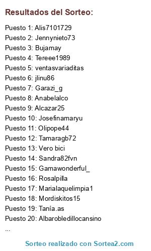 Lista de participantes: mariabm0903, gemmaarrieta76, Tereee1989, Esthemarco, Ares_2202, ventasvariaditas, Las_fofuchas_de_carmen, 3amoresmio, Joseantoniodomer, Gamawonderful_, Samsbehappy, jlinu86, Mi_cajita_de_abalorios, Depuntadaapuntada, Cayenico2016, Pyscys80, Enjoymakeup26, Bujamay, Rosalpilla, 1982_raquel, Gembrell, Isamaca93, _effy_stonem_, Marialaquelimpia1, Mordiskitos15, Albaqm306, Tanía.as, Patri_garcía04, Jesvaldeal, Malaga_muxoarte1973, Crochiqui, Oxidiana77, Sandra82fvn, Albarobledillocansino, Alcazar25, Elrincondechery, Tamaragb72, Nazita_gb, Jennynieto73, Alis7101729, Olipope44, Tere_ozileste, Josefinamaryu, Lorejaviiker, Noeliawe as, Soniah1983, Marta_vic, Piperlory29, Garazi_g, Vero bici, Dellapraelas, Albichuela1985, Anabelalco, Conchisiro, Oddierainbows.