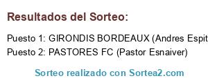 Lista de participantes: PASTORES FC (Pastor Esnaiver), GIRONDIS BORDEAUX (Andres Espitia).