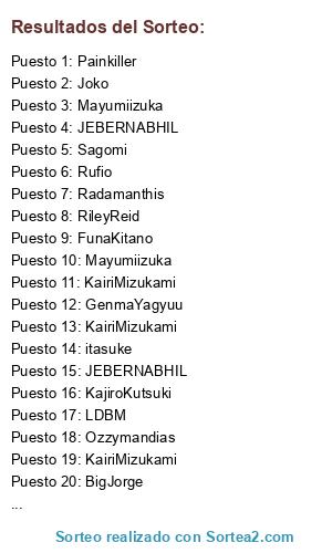 Lista de participantes: Sagomi(5), JEBERNABHIL(6), Rufio(6), KairiMizukami(4), Painkiller(4), itasuke(4), Radamanthis(4), GenmaYagyuu(3), RileyReid(9), FunaKitano(6), BigJorge(4), hanabi(3), MizukiTakumi(4), LDBM(8), BorutoUchiha(1), Ozzymandias(6), Joko(5), Mayumiizuka(2), marcelokiba(4), KajiroKutsuki(6).