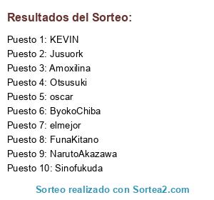 Lista de participantes: KairiMizukami(9), SetoUchiha(10), GenmaYagyuu(10), Bjersgsen(6), Ackerman(7), TobiSenju(8), ByokoChiba(17), RileyReid(6), Daizuky(4), IrukaDate(12), NotDark(4), FunaKitano(6), KenshiYazuki(9), Otsusuki(7), KEVIN(10), oscar(19), Jusuork(17), Sinofukuda(6), FumandoPorro(7), URIEL205(9), hanabi(7), elmejor(16), BorutoUchiha(3), ShiroTashiro(5), SuiroUchiha(14), KaguraUzuki(8), Amoxilina(10), NarutoAkazawa(16), leviatan(8), Fayrot(3), juanpro(5).