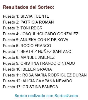 Lista de participantes: ALICIA CAMPANA NEVADO , ANUSKA CON K DE KOVA , ROCIO FRANCO , CRISTINA FANEGA , TONI RDGR , MANUEL JIMENEZ , BEATRIZ NUÑEZ SANTANO , PATRICIA ROMAN , BELEN GRACIA , ROSA MARIA RODRIGUEZ DURAN , SILVIA FUENTE , CRISTINA FRANCO CINTADO , JOAQUI HOLGADO GONZALEZ.