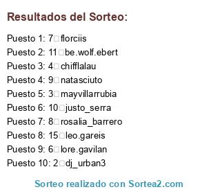 Lista de participantes: 1 nandorfg, 2 dj_urban3, 3 mayvillarrubia, 4 chifflalau, 5 macarenatallarico, 6 lore.gavilan, 7 florciis, 8 rosalia_barrero, 9 natasciuto, 10 justo_serra, 11 be.wolf.ebert, 12 roxana_bergara, 13 be.wolf.ebert, 14 be.wolf.ebert, 15 leo.gareis, 16 _valeska_, 17 karioca777, 18 agusechaniz.