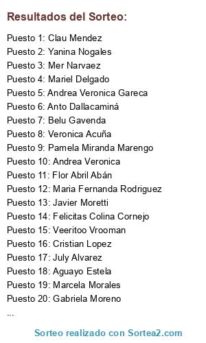 Lista de participantes: Maria Jose Balcarce(2 participaciones), Veeritoo Vrooman(2 participaciones), Mariel Delgado(2 participaciones), Javier Moretti(2 participaciones), Elegante Avelina(2 participaciones), Aguayo Estela(2 participaciones), Joha Fabian(2 participaciones), Marcela Morales(2 participaciones), Andrea Veronica Gareca(2 participaciones), Emilio Martín Sisterna(2 participaciones), Jesus Gamboa(2 participaciones), Javier Perez Roy(2 participaciones), Clau Mendez(2 participaciones), Belu Baigorria(2 participaciones), Belu Gavenda(2 participaciones), July Alvarez(2 participaciones), Carla Pérez(2 participaciones), Andrea Olivera(2 participaciones), Mer Narvaez(2 participaciones), Gabriela Rua(2 participaciones), Fer Herrera(2 participaciones), Pamela Miranda Marengo(2 participaciones), Maria Fernanda Rodriguez(2 participaciones), Andrea Veronica(2 participaciones), Veronica Urzagasti(2 participaciones), Gaabyy Neegriitaa Cja(2 participaciones), Mauro Rios(2 participaciones), Maria Rua(2 participaciones), Gisela Garnica(2 participaciones), Gabriel Gordillo(2 participaciones), Silvana Sanchez(2 participaciones), Anto Dallacaminá(2 participaciones), Felicitas Colina Cornejo(2 participaciones), Maria Eugenia Estrella(2 participaciones), Maria Flores(2 participaciones), Daniela Malco(2 participaciones), Cristian Lopez(2 participaciones), Gabriela Moreno(2 participaciones), Veronica Acuña(2 participaciones), Yanina Nogales(2 participaciones), Flor Abril Abán(2 participaciones), Natalia Soledad Núñez(2 participaciones), Irene Cruz(2 participaciones), Fernanda Cañari(2 participaciones), Luis Carraro(2 participaciones), Maria Eugenia Daher(2 participaciones), Ariel Echenique(2 participaciones), Mariela Angelica(2 participaciones), Diego Holmes(2 participaciones), Carolina Rossi(2 participaciones), Beatriz Elizabeth Olivera(2 participaciones), Aylen Rocio Alarcon(2 participaciones), Anabel Dominguez(2 participaciones), Hector L. Alarcon(2 participaciones).