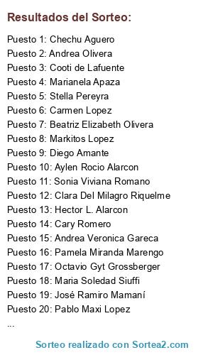 Lista de participantes: Andrea Veronica Gareca(2 participaciones), Maria Soledad Siuffi(2 participaciones), Cintya Sivila Semller(2 participaciones), Diego Martin Villavicencio(2 participaciones), Sonia Viviana Romano(2 participaciones), Octavio Gyt Grossberger(2 participaciones), Gise Monterichel(2 participaciones), Stella Pereyra(2 participaciones), Liz Marizol Aylan(2 participaciones), Alvaro Lf(2 participaciones), Chechu Aguero(2 participaciones), Belen Gonzalez(2 participaciones), Cary Romero(2 participaciones), Maki N. More(2 participaciones), Maria Eugenia Daher(2 participaciones), Pame Penn(2 participaciones), Rene Cardozo(2 participaciones), Cooti de Lafuente(2 participaciones), Andrea Olivera(2 participaciones), Markitos Lopez(2 participaciones), Marianela Apaza(2 participaciones), Andy Jimenez(2 participaciones), Aylen Rocio Alarcon(2 participaciones), Pablo Maxi Lopez(2 participaciones), Carmen Lopez(2 participaciones), Pamela Miranda Marengo(2 participaciones), Clara Del Milagro Riquelme(2 participaciones), José Ramiro Mamaní(2 participaciones), July Alvarez(2 participaciones), Hector L. Alarcon(2 participaciones), Mar Sol(2 participaciones), Beatriz Elizabeth Olivera(2 participaciones), Diego Amante(2 participaciones), Francisca Noelia Duarte(2 participaciones), Cinthia Guaymas(2 participaciones), Andrea Vides Skaf(2 participaciones).