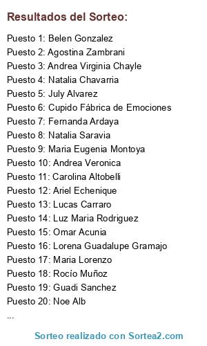 Lista de participantes: Cupido Fábrica de Emociones(3 participaciones), Antonella Guida(3 participaciones), Andrea Veronica(3 participaciones), Andrea Olivera(3 participaciones), Andrea Virginia Chayle(3 participaciones), En Busca De Sueños(3 participaciones), Andrea Melisa Andru(3 participaciones), Guadi Sanchez(3 participaciones), Natalia Chavarria(3 participaciones), Luz Maria Rodriguez(3 participaciones), Ne Miranda(3 participaciones), Maria Florencia Alberto Hanzerik(3 participaciones), Doris Eliana Gonzales(3 participaciones), July Alvarez(3 participaciones), Paula Roncaglia(3 participaciones), Maria Eugenia Montoya(3 participaciones), Luciano Livelli(3 participaciones), Omar Acunia(3 participaciones), Agostina Zambrani(3 participaciones), Fernanda Ardaya(3 participaciones), José Ramiro Mamaní(3 participaciones), Anita Loaiza(3 participaciones), Maria Lorenzo(3 participaciones), Natalia Saravia(3 participaciones), Carolina Altobelli(3 participaciones), Claudia Juárez(3 participaciones), Maxi Castillo(3 participaciones), Noe Alb(3 participaciones), Lucas Carraro(3 participaciones), Ángelez Lo(3 participaciones), Rocío Muñoz(3 participaciones), Ariel Echenique(3 participaciones), Belen Gonzalez(3 participaciones), Maria Elena Pintado(3 participaciones), Rodrigo Caro(3 participaciones), BeLu Cardozo(3 participaciones), Ayelen Gramajo(3 participaciones), Daniela Jimena Villagra(3 participaciones), Lorena Guadalupe Gramajo(3 participaciones).