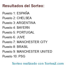 Lista de participantes: CHELSEA, MANCHESTER UNITED, MANCHESTER CITY, PSG, ESPAÑA, JUVE, BAYERN, BRASIL, ARGENTINA, PORTUGAL.