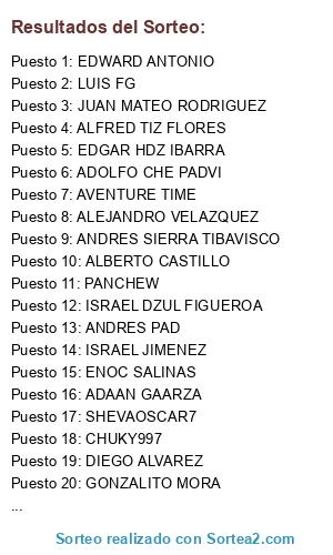 Lista de participantes: ANIBAL LEYVA, DIEGO ALVAREZ, CHUKY997, LUIS FG, EDGAR HDZ IBARRA, EFRAIM ORTIZ, ENOC SALINAS, EDWARD ANTONIO, JULIO CESAR RUIZ, SHEVAOSCAR7, ISRAEL JIMENEZ, PANCHEW, ADOLFO CHE PADVI, LUIS OLIVARRIA, ALEJANDRO VELAZQUEZ, ALFRED TIZ FLORES, ADAAN GAARZA, ANDRES SIERRA TIBAVISCO, ALBERTO CASTILLO, ISRAEL DZUL FIGUEROA, AVENTURE TIME, GONZALITO MORA, JUAN MATEO RODRIGUEZ, ANDRES PAD.