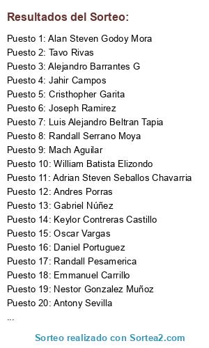 Lista de participantes: Adrian Steven Seballos Chavarria, Alan Steven Godoy Mora, Alejandro Barrantes G, Allan Andrey Briceño Chavarria, Andres Porras, Antony Sevilla, Cristhopher Garita, Daniel Portuguez, Diego Martínez, Emmanuel Carrillo, Gabriel Núñez, Jahir Campos, Jason Chaves, Jorsh Sb, Joseph Ramirez, Keylor Contreras Castillo, Luis Alejandro Beltran Tapia, Mach Aguilar, Nestor Gonzalez Muñoz, Oscar Vargas, Randall Pesamerica, Randall Serrano Moya, Rodrigo Uriarte, Tavo Rivas, William Batista Elizondo.