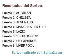 Lista de participantes: JUVENTUS, LAZIO, OLYMPIAKOS, AC MILAN, CHELSEA, LIVERPOOL, MANCHESTER UTD, SPORTING CP.
