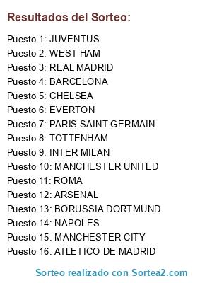 Lista de participantes: BARCELONA, REAL MADRID, PARIS SAINT GERMAIN, MANCHESTER UNITED, MANCHESTER CITY, JUVENTUS, CHELSEA, ATLETICO DE MADRID, ARSENAL, TOTTENHAM, BORUSSIA DORTMUND, INTER MILAN, NAPOLES, ROMA, EVERTON, WEST HAM.