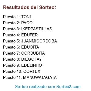 Lista de participantes: PACO, IKERPASTILLAS, EDUOITA, JUANMICORDOBA, DIEGOFAY, MANUWATAGATA, EDUFER, EDELINHO, CORTEX, TONI, CORDUBITA.