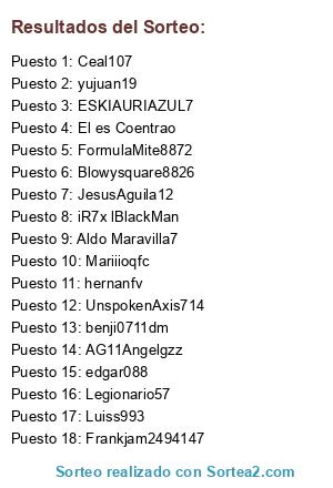 Lista de participantes: iR7x lBlackMan, Aldo Maravilla7, hernanfv, yujuan19, Ceal107, Mariiioqfc, edgar088, ESKIAURIAZUL7, Legionario57, Frankjam2494147, benji0711dm, UnspokenAxis714, AG11Angelgzz, Blowysquare8826, FormulaMite8872, El es Coentrao, JesusAguila12, Luiss993.