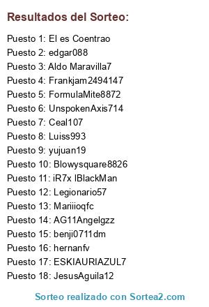Lista de participantes: iR7x lBlackMan, Aldo Maravilla7, hernanfv, yujuan19, Ceal107, Mariiioqfc, edgar088, ESKIAURIAZUL7, Legionario57, Frankjam2494147, benji0711dm, UnspokenAxis714, AG11Angelgzz, Blowysquare8826, FormulaMite8872, El es Coentrao, JesusAguila12, Luiss993.