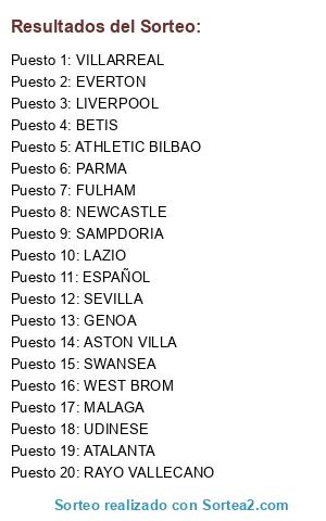 Lista de participantes: ATHLETIC BILBAO, BETIS, VILLARREAL, MALAGA, SEVILLA, ESPAÑOL, RAYO VALLECANO, ASTON VILLA, EVERTON, FULHAM, LIVERPOOL, WEST BROM, NEWCASTLE, SWANSEA, ATALANTA, GENOA, LAZIO, PARMA, UDINESE, SAMPDORIA.