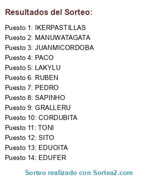 Lista de participantes: PACO, MANUWATAGATA, IKERPASTILLAS, EDUOITA, TONI, PEDRO, JUANMICORDOBA, GRALLERU, RUBEN, CORDUBITA, SAPINHO, LAKYLU, EDUFER, SITO.