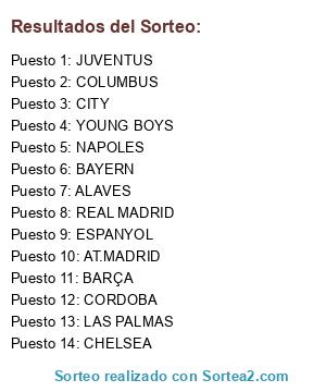 Lista de participantes: AT.MADRID, BAYERN, YOUNG BOYS, CHELSEA, COLUMBUS, CORDOBA, ALAVES, BARÇA, JUVENTUS, CITY, NAPOLES, ESPANYOL, REAL MADRID, LAS PALMAS.