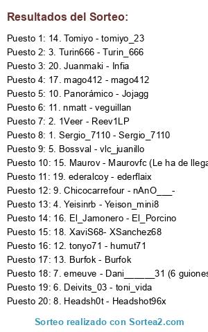 Lista de participantes: 1. Sergio_7110 - Sergio_7110, 2. 1Veer - Reev1LP, 3. Turin666 - Turin_666, 4. Yeisinrb - Yeison_mini8, 5. Bossval - vlc_juanillo, 6. Deivits_03 - toni_vida, 7. emeuve - Dani______31 (6 guiones bajos), 8. Headsh0t - Headshot96x, 9. Chicocarrefour - nAnO___-, 10. Panorámico - Jojagg, 11. nmatt - veguillan, 12. tonyo71 - humut71, 13. Burfok - Burfok, 14. Tomiyo - tomiyo_23, 15. Maurov - Maurovfc (Le ha de llegar el FIFA), 16. El_Jamonero - El_Porcino, 17. mago412 - mago412, 18. XaviS68- XSanchez68, 19. ederalcoy - ederflaix, 20. Juanmaki - Infia.