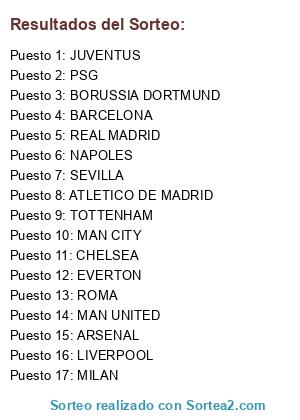 Lista de participantes: ROMA, EVERTON, ATLETICO DE MADRID, BARCELONA, REAL MADRID, LIVERPOOL, ARSENAL, MAN UNITED, JUVENTUS, MAN CITY, PSG, TOTTENHAM, NAPOLES, CHELSEA, MILAN, SEVILLA, BORUSSIA DORTMUND.