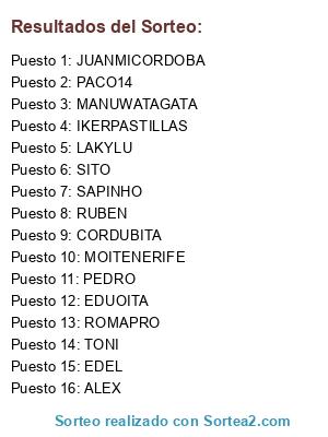 Lista de participantes: PACO14, JUAN ANGEL, FISTA, SERGIO_CULE, LAKYLU, GARRY, JUANMICORDOBA, SITO, SIR KAISER, REI DA RIA, TONI, RUBEN, MANUWATAGATA, IKERPASTILLAS, EDUOITA, MAJEITOR, MOITENERIFE, EDUFER, EDELINHO.