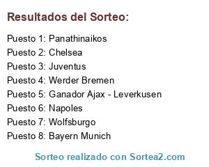 Lista de participantes: Napoles, Wolfsburgo, Werder Bremen, Panathinaikos, Chelsea, Juventus, Bayern Munich, Ganador Ajax - Leverkusen.