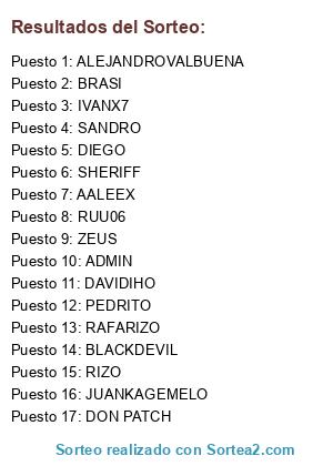 Lista de participantes: enzitoh27, Fernandogh7, myownhero34, Fercho_berg17, iLS_CAI, josedaza9, JOGAZURDO, gonzamb17, Zucho_8, LIDERBAR, NicoRC_22, michaelm106, Diyebure, Criisxt, Danielevil.