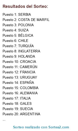 Lista de participantes: ARGENTINA, PORTUGAL, SUECIA, ALEMANIA, HOLANDA, ESPAÑA, GALES, URUGUAY, BRASIL, BÉLGICA, FRANCIA, COLOMBIA, POLONIA, INGLATERRA, COSTA DE MARFIL, ITALIA, SERBIA, CROACIA, CHILE, CAMERÚN, MÉXICO, GHANA, TURQUÍA, SUIZA.