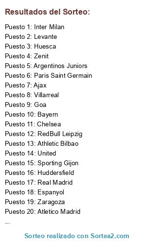 Lista de participantes: United, Zenit, Betis, Barça, Paris Saint Germain, Cartagena, Levante, Borussia Dortmund, Bayern, RedBull Leipzig, Pauli, Huddersfield, Chelsea, Celtic, Valencia, Goa, Zaragoza, Argentinos Juniors, Brentford, Inter Milan, Sporting Gijon, Villarreal, Osasuna, Liverpool, Ajax, Espanyol, Atletico Madrid, Boca Juniors, Athletic Bilbao, Ibiza, Huesca, Real Madrid.