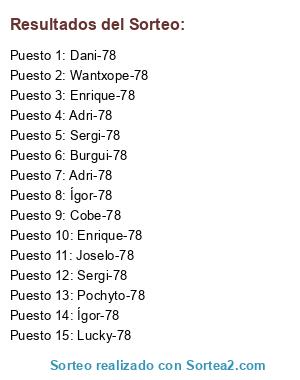 Lista de participantes: Enrique-78, Enrique-78, Pochyto-78, Ígor-78, Ígor-78, Lucky-78, Cobe-78, Burgui-78, Dani-78, Adri-78, Adri-78, Joselo-78, Wantxope-78, Sergi-78, Sergi-78.
