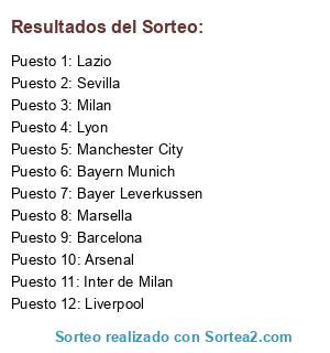 Lista de participantes: Bayer Leverkussen, Sevilla, Lazio, Manchester City, Marsella, Liverpool, Bayern Munich, Milan, Barcelona, Lyon, Inter de Milan, Arsenal.