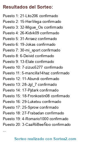 Lista de participantes: 3-CaaRiiBeeÑoo confirmado, 4-Romario1000 confirmado, 5-mancilla14haz confirmado, 6-Deivid confirmado, 7-zizuo5277 confirmado, 8-Shokerone confirmado, 9-Zanguangano confirmado, 10-Kentik confirmado, 11-Abundi confirmado, 12-Zlatan confirmado, 13-Elale confirmado, 15-HeriVega confirmado, 16-Wade1298 confirmado, 17-Pjdark confirmado, 18-Fronkostin08 confirmado, 19-Jokas confirmado, 20-LucKyPoWa confirmado, 21-Lito206 confirmado, 23-Mariomg confirmado, 24-Elfus21 confirmado, 25-Sprow confirmado, 26-Kidvk09 confirmado, 27-Frabadan confirmado, 28-Jgl_7 confirmado, 29-Luketxu confirmado, 30-mi_sport confirmado, 31-Arraez confirmado, 32-Migue_Os confirmado.