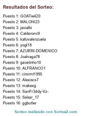 Lista de participantes: yogl18, GOATie420, Joalvaga78, ggbutler, Calderonc9, Alexiscs7, cirorml1995, javialbi, Sekar_17, gacelinho10, SanFr3ddy-Vz-, MALONI23, ALFRANCO1, makexg, kafuvalenzuela, AZURRI-DOMENICO.
