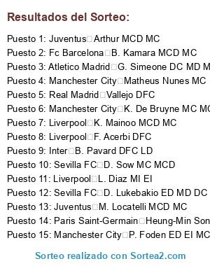 Lista de participantes: Manchester City E. Haaland DC, Manchester City Rodri MCD MC, FC Bayern Munchen H. Kane DC, Manchester City K. De Bruyne MC MCO, Real Madrid J. Bellingham MCO MC, Real Madrid Vini Jr. EI DC, Real Madrid K. Mbappe DC EI, Fc Barcelona M. ter Stegen POR, Inter L. Martinez DC, Liverpool V. van Dijk DFC, Liverpool Alisson POR, Real Madrid T. Courtois POR, Atletico Madrid A. Griezmann DC MI, Atletico Madrid J. Oblak POR, Real Madrid F. Valverde MC MD, Real Madrid A. Rüdiger DFC, FC Bayern Munchen J. Musiala MCO MI MC, FC Bayern Munchen D. Rice, FC Bayern Munchen J. Kimmich MCD LD, Inter A. Bastoni DFC, Inter N. Barella MC MCD, Inter Y. Sommer POR, Manchester City P. Foden ED EI MCO, Manchester City Ruben Dias DFC, Manchester City Theo Bernard François Hernandez, Manchester City Ederson POR, Paris Saint-Germain G. Donnarumma POR, Paris Saint-Germain Marquinhos DFC, Atletico Madrid L. Modric MC MCO MCD, Fc Barcelona Pedri MC EI, Fc Barcelona J. Kounde LD DFC, Fc Barcelona F. de Jong MC MCD, Inter H. Çalhanoğlu MCD MC, Juventus Bremer DFC, Liverpool A. Mac Allister MC MCD, Liverpool T. Alexander-Arnold LD, Manchester City Bernardo Silva MC ED, Paris Saint-Germain Heung-Min Son, Real Madrid Rodrygo ED DC, Real Madrid Carvajal LD, Atletico Madrid Nico Williams, Fc Barcelona Dani Olmo, Fc Barcelona Raphinha ED EI MD, Fc Barcelona W. Szczesny POR, FC Bayern Munchen Palhinha MCD MC, FC Bayern Munchen M. Neuer POR, Liverpool Diogo Jota DC EI, Liverpool L. Diaz MI EI, Paris Saint-Germain O. Dembele ED MCO, Paris Saint-Germain Vitinha MC MCD, Paris Saint-Germain A. Hakimi LD, Paris Saint-Germain N. Kanté, Real Madrid A. Tchouameni MCD MC DFC, Real Madrid eder Militao DFC, Real Madrid D. Alaba DFC LI, Real Madrid Cristiano Ronaldo, Atletico Madrid J. Alvarez DC MCO, FC Bayern Munchen M. Olise MD ED, FC Bayern Munchen K. Coman MI MD, Inter M. Thuram DC, Inter F. Dimarco LI MI, Inter L. Sane MD MI ED, Inter B. Pavard DFC LD, Juventus D. Vlahovic DC, Juventus J. Maddison, Liverpool I. Konate DFC, Liverpool F. Acerbi DFC, Manchester City J. Gvardiol LI DFC, Manchester City M. Akanji DFC, Manchester City N. Ake DFC LI, Manchester City J. Stones DFC MCD LD, Manchester City İ. Gündoğan MC MCD, Paris Saint-Germain A. Lookman, Real Madrid J. Frimpong, Atletico Madrid R. Le Normand DFC, Atletico Madrid O. Marmoush, Atletico Madrid C. Nkunku MCO DC, Atletico Madrid Marcos Llorente MD LD MC, Atletico Madrid J. Gimenez DFC, Atletico Madrid Koke MCD MC, Fc Barcelona Lamine Yamal ED EI, Fc Barcelona B. Kamara MCD MC, FC Bayern Munchen A. Davies LI MI, FC Bayern Munchen D. Upamecano DFC, FC Bayern Munchen K. Laimer LD MCD MC, FC Bayern Munchen Kim Min Jae DFC, FC Bayern Munchen K. Koulibaly, Inter K. Havertz, Inter S. de Vrij DFC, Inter H. Mkhitaryan MC MCO, Juventus Gavi MC EI, Juventus Douglas Luiz MC MCD, Juventus M. Locatelli MCD MC, Juventus T. Koopmeiners MC MCO, Liverpool C. Gakpo MI EI DC, Liverpool A. Robertson LI, Manchester City F. Chiesa MD MI DC, Manchester City M. Kovačic MC MCD, Paris Saint-Germain Nuno Mendes LI, Real Madrid E. Camavinga MC MCD LI, Real Madrid R. De Paul MC MCD, Real Madrid F. Mendy LI, Atletico Madrid N. Molina LD, Atletico Madrid A. Sørloth DC, Atletico Madrid T. Müller MCO DC MD, Fc Barcelona Savinho EI ED, Fc Barcelona Balde LI LD MI, Fc Barcelona J. David, FC Bayern Munchen L. Goretzka MC MCD, Inter D. Dumfries LD MD, Juventus D. Hancko, Liverpool R. Gravenberch MCD MC, Liverpool Iñaki Williams, Manchester City K. Walker LD, Paris Saint-Germain B. Barcola EI ED, Real Madrid J. Grealish EI MI, Real Madrid S. Gnabry MD MI DC, Sevilla FC Iñigo Martinez DFC, Fc Barcelona F. Kadıoğlu, Inter P. Zieliński MC MCD, Inter M. Darmian LD DFC MD, Juventus A. Milik DC, Juventus B. Henrichs, Liverpool D. Szoboszlai MCO MC, Manchester City S. Ortega POR, Paris Saint-Germain Joao Neves MC MCD, Paris Saint-Germain R. Kolo Muani DC, Real Madrid A. Lunin POR, Sevilla FC D. Frattesi MC MCO, Atletico Madrid Reinildo LI DFC, Atletico Madrid A. Witsel DFC, Juventus N. Gonzalez ED MD EI, Juventus M. Di Gregorio POR, Juventus Marco Asensio ED DC MC, Liverpool C. Jones MC MCO MCD, Liverpool W. Endo MCD MC, Manchester City J. Doku EI ED, Paris Saint-Germain W. Zaïre-Emery MC MCD, Paris Saint-Germain W. Pacho DFC, Sevilla FC M. Rashford, Sevilla FC Suso MD MCO MC, Sevilla FC J. Gomez DFC LD LI, Sevilla FC Mario Hermoso DFC, Sevilla FC M. Taremi DC, Sevilla FC N. Gudelj DFC MCD, Atletico Madrid Samuel Lino MI EI, Atletico Madrid J. Musso POR, FC Bayern Munchen S. Boey LD, FC Bayern Munchen H. Ito DFC LI, Inter M. Lazzari, Inter M. Arnautovic DC, Juventus M. Perin POR, Liverpool C. Kelleher POR, Paris Saint-Germain P. Kimpembe DFC, Sevilla FC D. Lukebakio ED MD DC, Atletico Madrid Riquelme MI, Fc Barcelona Eric Garcia DFC MCD LD, FC Bayern Munchen Francisco Conceiçao MD ED, Inter C. Ejuke MI MD EI, Juventus P. Kalulu DFC LD, Juventus A. Cambiaso LD LI MD, Juventus F. Gatti DFC, Juventus W. McKennie MC MCD, Liverpool H. Elliott MCO MC ED, Liverpool K. Mainoo MCD MC, Liverpool T. Tomiyasu LD LI, Manchester City Matheus Nunes MC MI, Paris Saint-Germain Fran Garcia LI, Sevilla FC A. Adli DC MI MCO, Sevilla FC D. Sow MC MCD, Sevilla FC T. Werner, Fc Barcelona Ansu Fati MCO MI DC, FC Bayern Munchen M. Tel DC MI MD, Inter Y. Bisseck DFC, Juventus Arthur MCD MC, Paris Saint-Germain Lucas Beraldo DFC LI, Paris Saint-Germain M. Safonov POR, Sevilla FC D. Doue EI MC, Fc Barcelona Fermin MC EI MCO, Fc Barcelona A. Hložek, FC Bayern Munchen A. Pavlovic MCD MC, Liverpool C. Bradley LD, Sevilla FC Adria Pedrosa LI, Sevilla FC G. Montiel LD, Sevilla FC Ø. Nyland POR, Inter Josep Martinez POR, Sevilla FC A. Sambi Lokonga MC MCD, Atletico Madrid G. Simeone DC MD MI, Fc Barcelona Pau Cubarsi DFC, FC Bayern Munchen S. Ulreich POR, Manchester City R. Vargas, Sevilla FC Carmona LD MD, Sevilla FC alvaro POR, Juventus K. Yildiz EI MI DC, Real Madrid Vallejo DFC, Sevilla FC V. Barco LI MI, Fc Bar