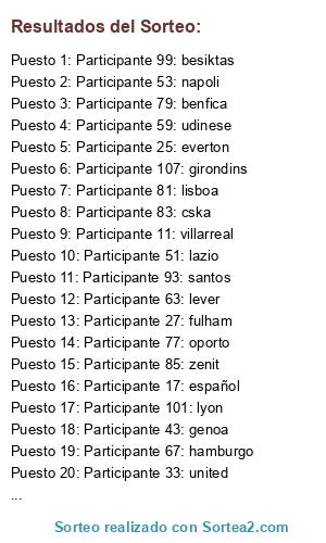 Lista de participantes: Participante 1: r.madrid, Participante 3: barcelona, Participante 5: a.madrid, Participante 7: sevilla, Participante 9: valencia, Participante 11: villarreal, Participante 13: malaga, Participante 15: bilbao, Participante 17: español, Participante 19: a.vila, Participante 21: arsenal, Participante 23: chelsea, Participante 25: everton, Participante 27: fulham, Participante 29: liverpool, Participante 31: city, Participante 33: united, Participante 35: tothenham, Participante 37: sunderland, Participante 39: newcastle, Participante 41: milan, Participante 43: genoa, Participante 45: fiore, Participante 47: juve, Participante 49: inter, Participante 51: lazio, Participante 53: napoli, Participante 55: roma, Participante 57: palermo, Participante 59: udinese, Participante 61: bayern, Participante 63: lever, Participante 65: dortmund, Participante 67: hamburgo, Participante 69: bremen, Participante 71: worls, Participante 73: sttu, Participante 75: shalke, Participante 77: oporto, Participante 79: benfica, Participante 81: lisboa, Participante 83: cska, Participante 85: zenit, Participante 87: ajax, Participante 89: psv, Participante 91: pana, Participante 93: santos, Participante 95: gala, Participante 97: fener, Participante 99: besiktas, Participante 101: lyon, Participante 103: marsella, Participante 105: lille, Participante 107: girondins, Participante 109: psg.