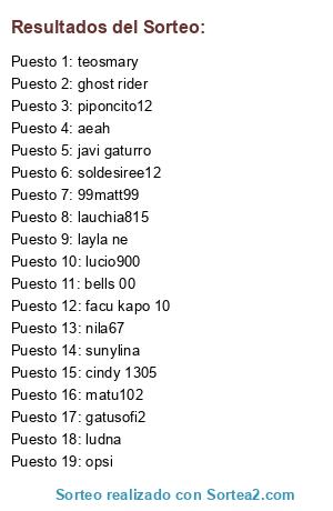 Lista de participantes: sunylina, ludna, teosmary, bells 00, facu kapo 10, ghost rider, 99matt99, cindy 1305, lucio900, nila67, soldesiree12, matu102, opsi, piponcito12, javi gaturro, aeah, gatusofi2, layla ne, lauchia815.