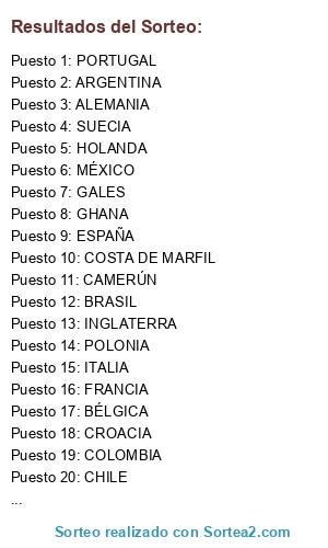 Lista de participantes: SERBIA, COSTA DE MARFIL, POLONIA, SUIZA, BÉLGICA, CHILE, TURQUÍA, INGLATERRA, HOLANDA, CROACIA, CAMERÚN, FRANCIA, URUGUAY, ESPAÑA, COLOMBIA, ALEMANIA, ITALIA, GALES, SUECIA, ARGENTINA, MÉXICO, BRASIL, GHANA, PORTUGAL.