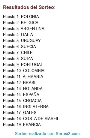 Lista de participantes: SUECIA, HOLANDA, ARGENTINA, PORTUGAL, ESPAÑA, COSTA DE MARFIL, ALEMANIA, URUGUAY, GALES, BRASIL, FRANCIA, BELGICA, POLONIA, ITALIA, CROACIA, CHILE, COLOMBIA.