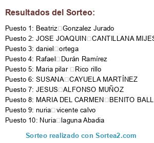 Lista de participantes: Laura Serrano Gracia, Yolanda Serrano Granger, Paloma Serrano Granger, Carlos Serrano Granger, Jorge Serrano Granger, estefania roldan lopez, Rocío Laureano Adame, MACARENA ANGUITA GALVEZ, Paula Lago Pereira, Beatriz Gonzalez Jurado, EVA MARIA DIEZ GARCIA, Leticia Jimenez, Rosa Maria Gallego Lara, PAULA BELLVER MORA, felipe gil lopez, mercedes ramos reina, CONCHI GUIRADO RAMIREZ, MAITE RUIZ SANTAMARIA, Esther Ruiz de la Fuente, sara santiago Gómez, Paloma Garcia Barrigon, andrea baños roig, Mabel Fernandez, Sara Victorio Gomez , Ana maria Rodríguez Villar , Sylwia Polkowska, Cristina Rilova Martín, Maria Elena Egea Navarro, Patricia Ramos Catalan, Sonia Sánchez Pérez, Patricia Fernández Rubio, CRISTINA VALLESPIN VILLARROYA, patricia Andrade Lago, Laura Rodriguez Sanchez, rosario perez marin, monica Llagostera cobler, Jezabel Sierra Pérez , Maricarmen martin-perez gomez, maria reyes castillo, Elena Ubeda Martinez, CARINA SÁNCHEZ DE JESÚS, INES CALDERON ABADIA, Mónica Navarro Díaz, Natalia Martinez Gonzalez, susana badia, Gloria Vargas Mateos , Ana Maria fernandez Cabrera, eva diaz marcos, Silvia Aguilera montes , agustin alcantara garcia, elena delgado crespo, SONIA GARCIA, irma ulloa Gómez, Raquel González Vera, Paola Guerrero Martínez, laura fito alonso, Lucía González Domínguez, Isabel Garzón Garcia, Sonia Sanchez touriño , Elena Alfaro, Eva Onaindia Roldan, Almudena Rodríguez abascal, Beatriz Gomez cortes, NEREA ARBEO PLANELLES, Xavier Calvo Zuluaga, Vanessa Jurk , DOLORS MARTINEZ, marta diaz gonzalez, Eva Ferrer Cursa, Pedro Mañanas de Vega, Angela Diaz-maroto Remesal , MAYTE HORCAJUELO DE ARRIBA , Maria Dolores López Alonso, SILVIA PINILLA MUÑOZ, NEREAA ARBEO PLANELLES., Gimena Nande Castaño, XABIER BEIZAMA ARRIZABALAGA, Isabel Abel Zapico, Silvia Martinez García , Juncal Gil Velazquez, YAMILA CENTURION MERODO, Eva Toro, MAITE RUIZ SANTAMARIA, Gema solis gundin, Mar Hernández Trujillo, olga ALONSO PEIROTEN, Dunia Rivero alvarez, Nuria Ángel Ramos, Maria Teresa Mateo Encabo, Tamara Lopez saez, Cynthia Fabiola Bravo Bravo , Rocío Calle Salado , NATALIA BLANCO GONZALEZ, Marta de Dios, Isabel María Cantarero Muñoz, nuria fonseca, Ester Alonso Legido, TERESA PASCAL ERANSUS, Natalia Barrera Jiménez, Paz Abellan Saez, Ana María Ruz Martínez , Giovanni Bergamo, Sonia Navarro parra, Karen Perez Carusi , Teresa Antuña García, Maria Jimenez Ortega , marta lópez peris, isabel caro sanz, Sabina Oriola, Natalia Carolina Balcazar Torres, Vanessa Tomás Igual, Daniella Maidana Montoy, CÉSAR JAVIER LIPCEN ICIKSONAS, Rosilene Chaves, Ana Reina, yolanda de los santos del pozo, Carolina Amaya, fany fernandez, Raquel Zafra Panadero, helena boix domingo, gema martin , Nuria Requena Olea, Ana Iturbe Zabala, marcela cretu, marina tejero raga, SILVIA MARTINEZ GARCIA, Ana diaz, Maria del mar Fernández viruega, NURIA SAN JOSE MOLINA, Jose Manuel Lopez Damas de la Prida , conchi Madueño Amodeo, Oiane Picaza iglesias, Cristina Hidalgo girela, maria santinlopez , Sandra Rabuñal Valle, maria del mar cladera bestard, Mónica Fernández Curiel, María Dolores Caamaño Lata, sandra diez martinez, Andrea zuaznabar, Haizea Diaz Gallego, natalia diez belver, gdfgf dfgdfg, Ana Fernández Escalona, Rosa MANZANO RAMIREZ, Eva Molina Martinez, SAMUEL CUMPLIDO SANTIAGO, Ardiel Cruz Negrin, Miriam Lorca Perez, Almudena barrios baños, Rolando Gil Pulido, EVA GONZALEZ RIAL, María Gabriela Centeno Lorenzo, LORENA GONZALEZ ESPINAR, Raquel Lopez alcoy, Garazi Sampedro Arando, Esther Corrochano Garcés, GARA DE PAZ LUGO, Inés Sánchez Lara, leire sagarduy, Ainhoa Montesinos , vicky borras marin, Olga de pablo, Belén Carmona Gil, María jose Lavado Padilla , Cosme Cuenca, Karen López , Carmen Casamichana Muñoz, alberto navarro palop, Elizabeth Ramirez Villa , MIGUEL ANGEL MONTERO GARRIDO, ANA ISABEL VILCHES CRESPO, Maria Julia Barea Costanza, MARIA JOSE DE LA CRUZ BARATO, Arturo Gross Alesanco, Natividad Entrena, Pilar Martinez Coveta, Lorena Garcia Guerrero, Esther González Carmona, M CATALINA HERNANDEZ RAMOS, Katherine Uriol Rivera, GERALDINE edo FERRIZ, Jatsue Cabrejos Azama, Silvia Torres Melero, CAROLINA MARIN, Lidia García Díaz, mamen sanchez gomez, Ainoa Ortega García , ANNA M. JOU SOLES, Roberto Santana González, Cecilia Estremera Martínez, Ana Maria Martin Bea, Maria Belen Castañeda Lara, Daniel Roiz de la Parra, M ÁNGELES FREYRIA NÚÑEZ, Nekane Prieto Romero, Àngela Sánchez Arbó, Antonio Perez Ruiz, EVA LOPEZ LUNA, Maribel rodriguez avila, nuria vicente calvo, francisca casellas oliver, Asun Costa Lancuentra, carmen villa silva, Cristina Mª Queiruga Calo, LOLA POZO CRESPIN, Yesenia Vinces López , angela perez tomillo, RITA ARNAU RIERA, Victoria Garcia Guirado, Rodrigo Jesús Amaro Castro, Laura Argudo muñoz, Maite Jesús Iglesias, elena cruz lozano, ENCARNACION CANO HERNANDEZ, Gloria SALAZAR, sandra burgos delgado, CRISTINA ALVAREZ PARDILLOS, Tina Segovia Sillero, Javier Lopez Ruiz, Nieves Ceballos, elena serrano garcia, Leire Gonzalez de Celis, cristina navarro martin, OLGA VILLA, Adela Sandoval Mora, Estela Muñoz, veronica casal lopez, SANDRA VASALLO MONTEAGUDO , susana marcos mateos, Virginia Perez idero, Jessica Alvarez Cañas, Mónica Rodríguez, Mariana Espinosa Portillo, Selynna Jethani, Claudia Uviña marti, Marilo Mora Diaz, Yolanda Barrionuevo martín , Maria jose Ortega capellan, cristian caballero, CARMEN FERNANDEZ GONZALEZ, Tamara Sevillano, Zulema García Díaz, Ana Piñas, SORAYA BAÑOS LOPEZ, sonia moreno plaza, Yolanda Pineda, marta toboso rubio, África longas, Mavi Díaz Martinez, M Tamara Huertas Sanchez, Adoracion Martínez zarzuela, Mª ESMERALDA BUGARIN DOMINGUEZ, monica sandru, Eva María Leal Diaz, cristina muñoz martin, Stephanie Díaz Crespo, Arantxa Alcalde Manrique , Sylvia Ximenis Massot, Minerva Ruiz González, AMELIA TRAVESI FERNANDEZ, maria san miguel sevilla, SARA PAGAN CARRASCO, Damaris Alves Gonzalez