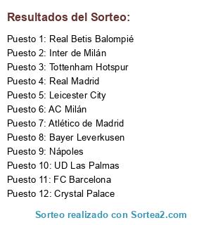 Lista de participantes: Real Betis Balompié, Atlético de Madrid, AC Milán, Bayer Leverkusen, Leicester City, Inter de Milán, Real Madrid, Nápoles, UD Las Palmas, Tottenham Hotspur, Crystal Palace, FC Barcelona.
