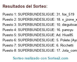 Lista de participantes: SUPERBUNDESLIGUE: 17. Jota_comunio, SUPERBUNDESLIGUE: 10. dieguitoasecas11, SUPERBUNDESLIGUE: 5. Polete (Ayuda....hace imagenes y eso....), SUPERBUNDESLIGUE: 18. x_jzone_x, SUPERBUNDESLIGUE: 6. Ricchetti, SUPERBUNDESLIGUE: 31. fox_519, SUPERBUNDESLIGUE: 16. panoyu, SUPERBUNDESLIGUE: Ad. Hius85.