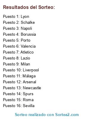Lista de participantes: Sevilla, Valencia, Málaga, Atletico, Arsenal, Liverpool, Newcastle, Spurs, Milan, Napoli, Lazio, Roma, Borussia, Schalke, Lyon, Porto.