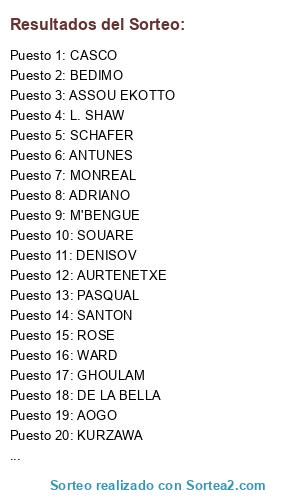 Lista de participantes: MONREAL, BEDIMO, DIGNE, ANTUNES, KURZAWA, ADRIANO, FERNANDO NAVARRO, AOGO, SANTON, OCZIPKA, CASCO, SCHAFER, R. MOTTA, L. SHAW, WENDT, JEFFERSON, DE LA BELLA, M'BENGUE, SOUARE, KADLEC, WARD, AURTENETXE, PASQUAL, DENISOV, GHOULAM, CISSOKHO, ASSOU EKOTTO, ROSE.
