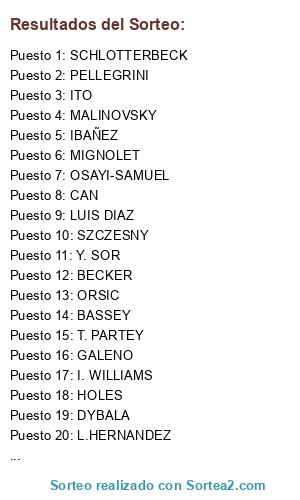 Lista de participantes: SZCZESNY, MIGNOLET, BASSEY, IBAÑEZ, L.HERNANDEZ, SCHLOTTERBECK, OSAYI-SAMUEL, T. PARTEY, HOLES, CAN, PELLEGRINI, OSCAR, GALENO, O. NWOBODO, MALINOVSKY, ORSIC, ITO, DYBALA, I. WILLIAMS, Y. SOR, LUIS DIAZ, BECKER.