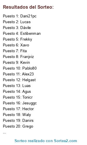 Lista de participantes: Agus, Atomics, Dávile, Dani21pc, Danirs, Estibenman, Fita, Franjviz, Frekky, Grego, Helgast, Hector, Jesuggc, Kevin, Luas, Lucas, Mario, Miconet, Pablo80, Tonicr, Victor, Waly, Xavo, Alex23.