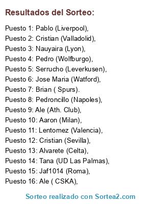 Lista de participantes: Cristian (Sevilla),, Nauyaira (Lyon),, Pedroncillo (Napoles),, Serrucho (Leverkusen),, Pablo (Liverpool),, Jose Maria (Watford),, Jaf1014 (Roma),, Pedro (Wolfburgo),, Tana (UD Las Palmas),, Ale (Ath. Club),, Alvarete (Celta),, Aaron (Milan),, Cristian (Valladolid),, Lentomez (Valencia),, Ale ( CSKA),, Brian ( Spurs)..
